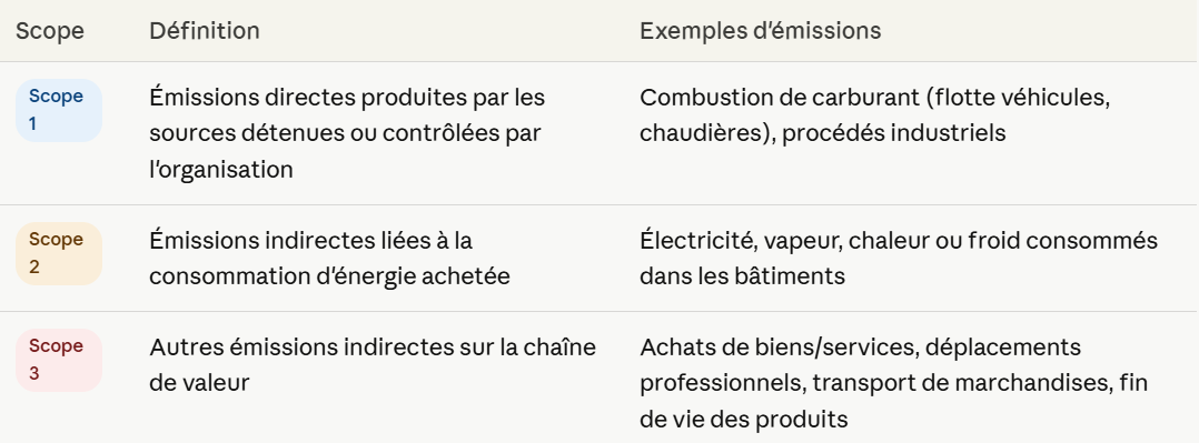 Le bilan carbone (BEGES) repose sur une méthodologie structurée autour de trois périmètres d'émissions, appelés "scopes", issue du GHG Protocol (standard international de comptabilisation des GES) :