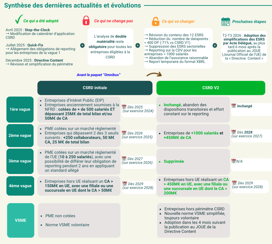 - Directive Content (décembre 2025) : révision majeure du périmètre, baisse du nombre de datapoints (<400), suppression des ESRS sectoriels et report du format XBRL .